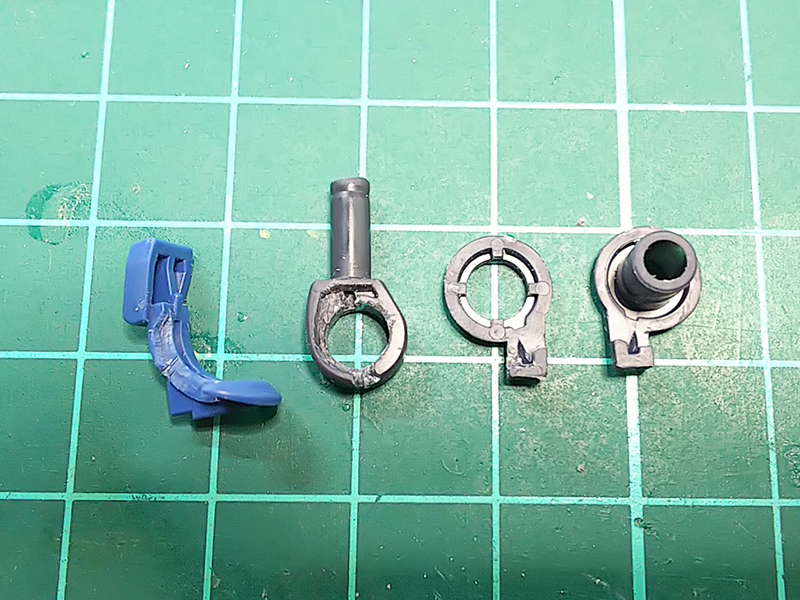 肘部分の関節の加工から。画像の4つの部品があって、その内の3つを加工する事で何とかなる。まずは右から2個目の部品(B26)をちょっとだけ削る。φ0.28が2本通れば良いので、0.6mm程度の切欠きを作れば良い。