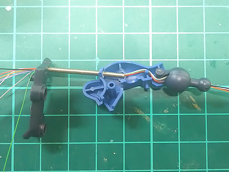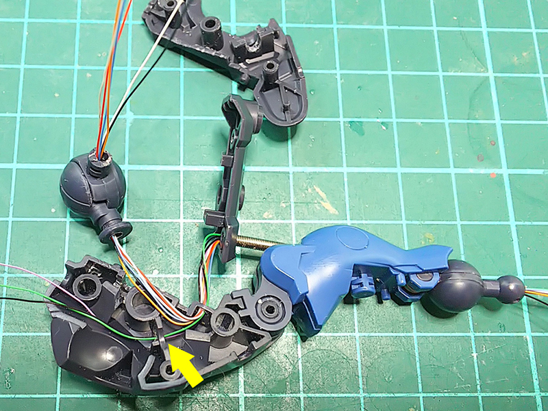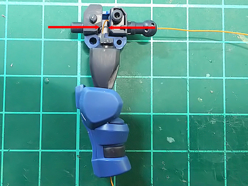 最終的には関節を全開で曲げた状態で通して配線長を決めておくと、関節を伸ばした時には画像の様に弛んでパーツの隙間に余った状態になるので、間接の曲げでケーブルが強く引っ張られて切れたりすることは無い。