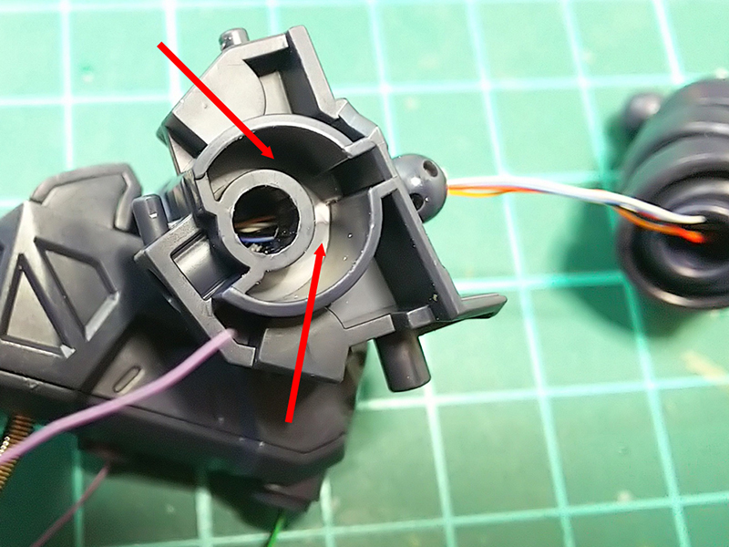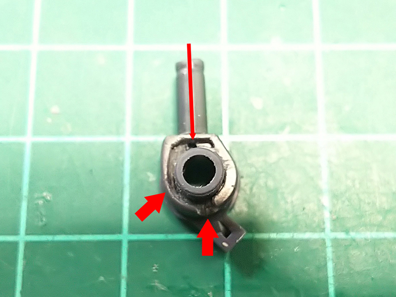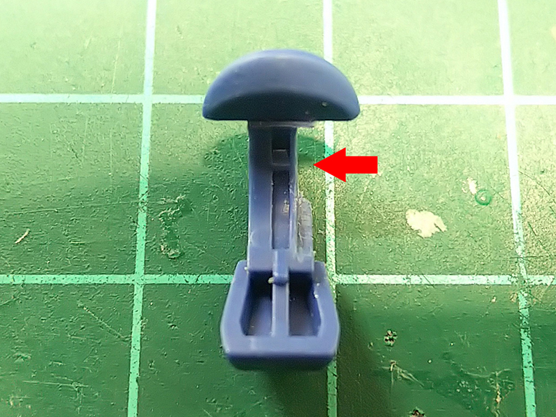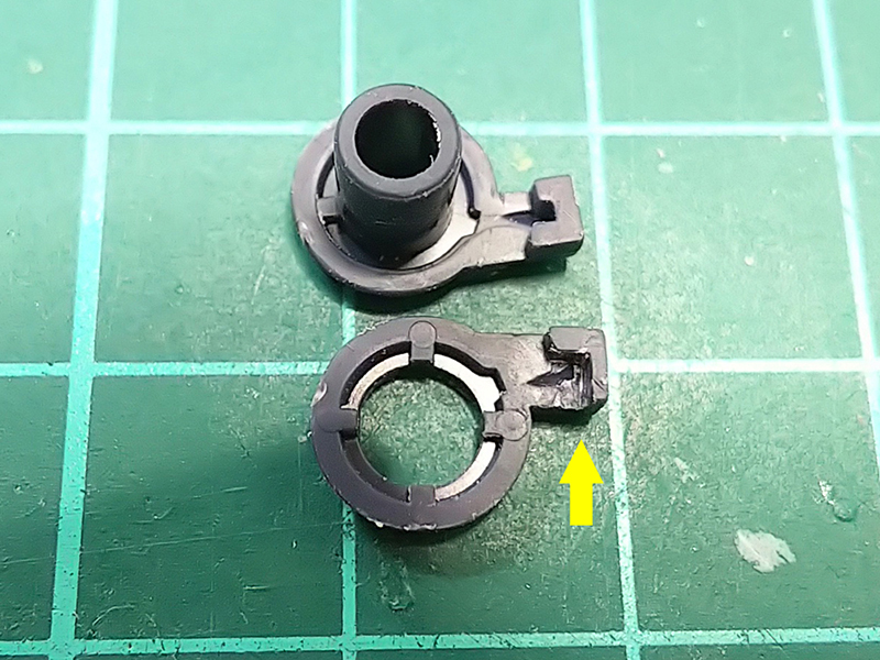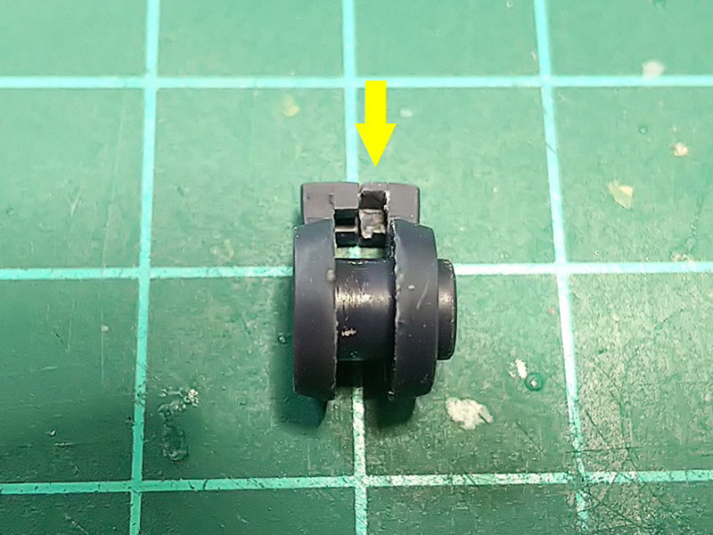 黄色矢印部分を削り落とすと、組み合わせた時にほんの少しだけ隙間が出来る。