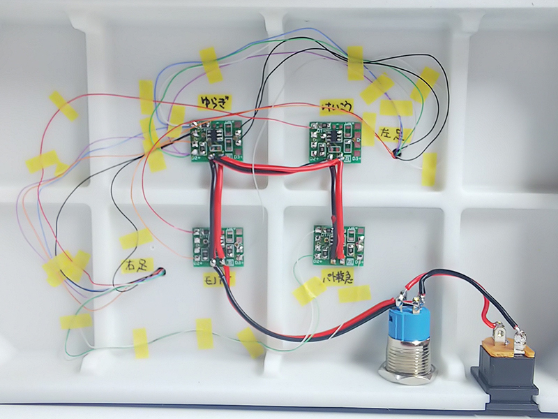 マイコンチップのみで組み込む方法であれば、逆にかなりのスペースがあるが、今回はあくまでも電装野郎を製品そのままで接続しただけで、光に動きを付ける事を目的とした製作だったので、仕方なく全ての基板を台座の中に仕込み全てのLEDの配線を両足から台座に落とし込む。という方法で製作した。