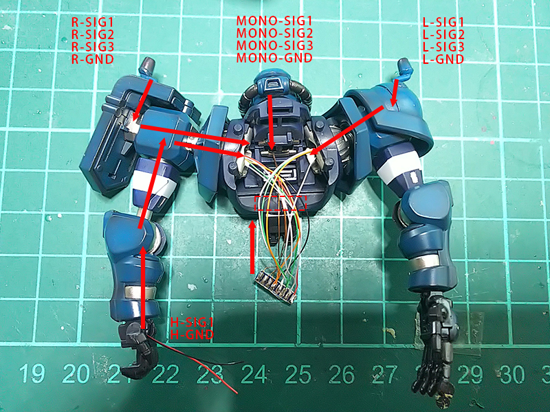 LEDの数が全部で左右パトライト6個+モノアイ3個+ヒートホーク8個+バーニア6個の合計23個使用しているので、単純に1個当たり3~5mAで点滅点灯させるとしても、69mA~115mA程度の電流となるので仕様上ケーブル1本では電流容量的に余裕度が無いので、本数を束ねてGNDラインを確保するというのが理由。