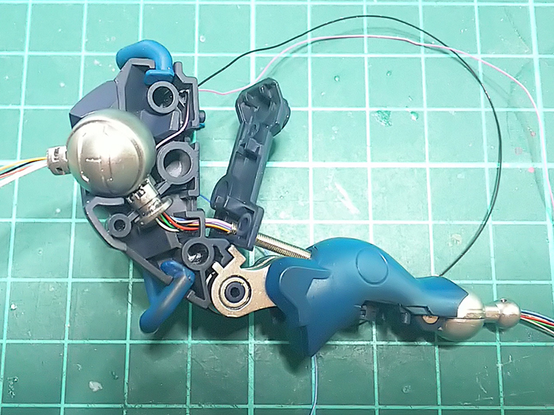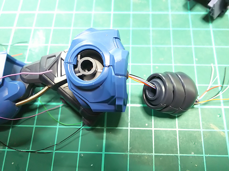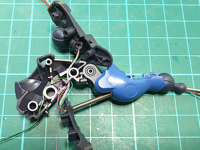腕にも関節があって、キットのままでは配線を通す事が出来ないので、穴を開けたり削ったりして、外観を損なわず、配線が見えないように、出来れば関節を動かしても配線がなるべく切れないように。。。