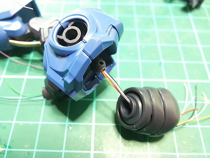 両肩パトライト、モノアイ、右腕の配線が出来たら、胴体へ配線を通していく。
