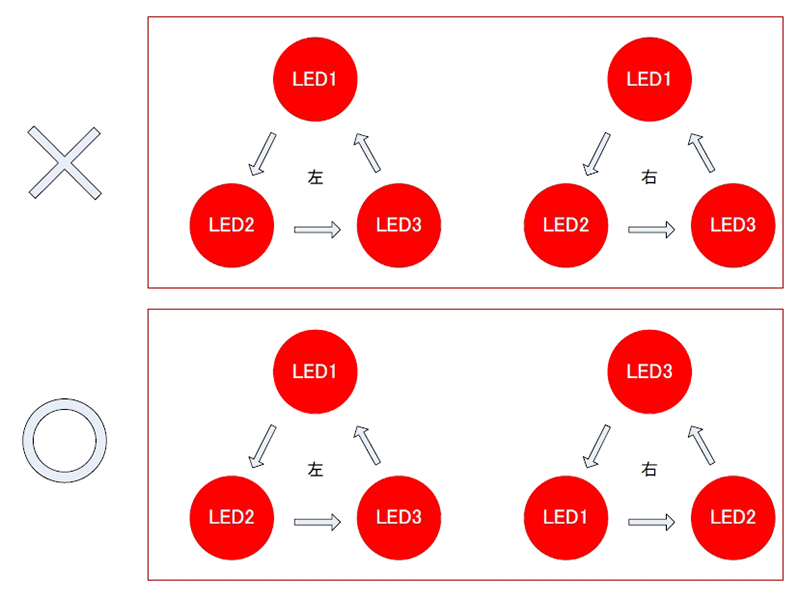 図では、点灯する回転方向は同じで順番を1つズラした例だけど、左右で回転方向を真逆に接続してもOK。