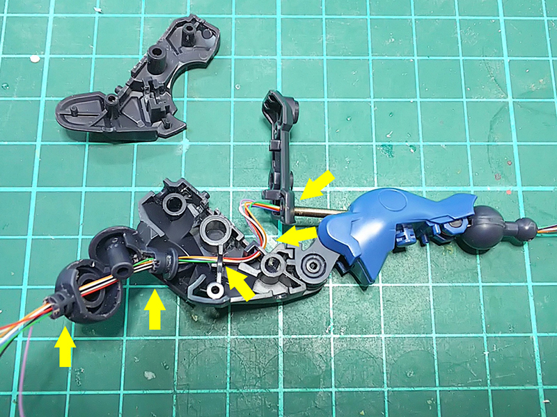 画像の左側からは肩のパトライトからのケーブルが4本入ってきて、右側にヒートホークからの2本の合計6本が通り、胴体の方へ抜けていく。