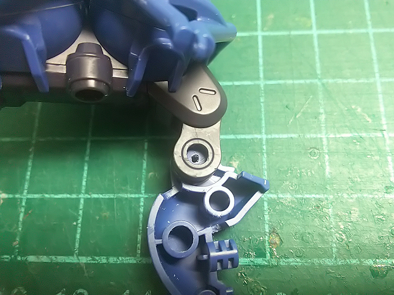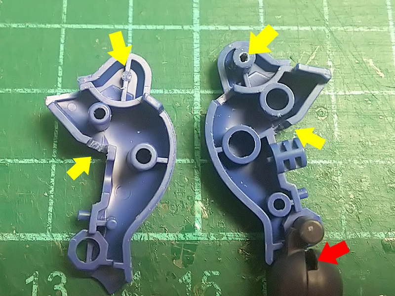 肩部分はB21とB24の関節ジョイントパーツの軸部分に赤矢印の様にそれぞれ貫通穴を開けるだけで良い。