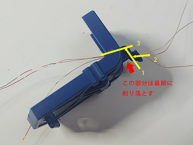 黄色の矢印1、2、3の順でピンバイスでφ0.5mmの穴を開けて、1の穴の所だけ上側から溝を掘って配線を通していく。
