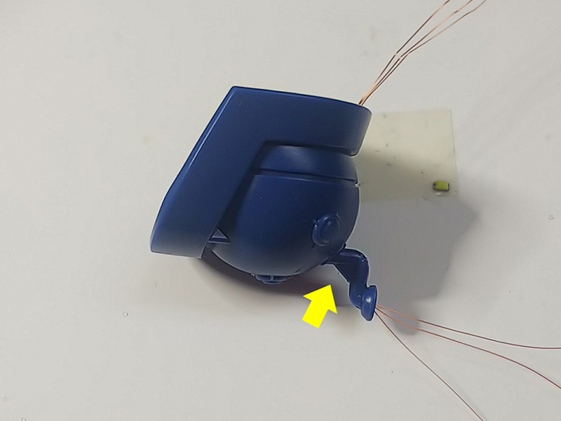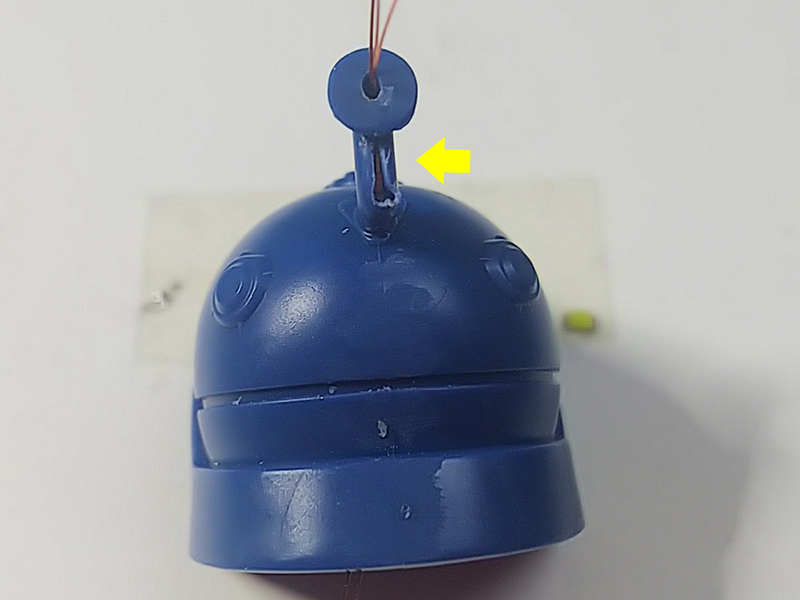 加工は単純にボールジョイントの軸部分にピンバイスでφ1.0mmの貫通穴を開け、アイスブルーのLEDを埋込後UVレジン透明で封入。