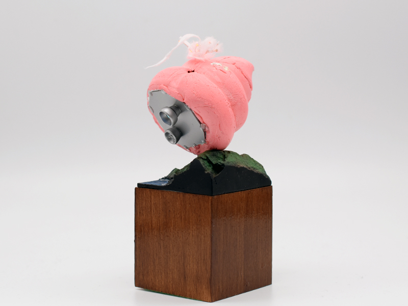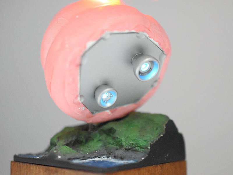 ただ、本当は真っすぐ正面で宙に浮いているうんこで横っ腹にミサイルを食らっているイメージだったのだけど、底面が大きな穴で、こんなに中が空洞だとは思ってなかったので、この重さの物を支えることが難しそうなこともあったので、一番支柱を刺せる距離が長そうな位置に穴を開けることにして、斜め向きに配置することにした。まか、結果的にはバーニア部分の電飾も見えやすくなるし。