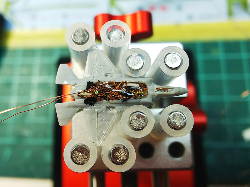 最終的には、機体から外に出てくるケーブルはプラスとマイナスの2本だけにして、ジェットノズル部分から外に出して、外部から電力を供給する。