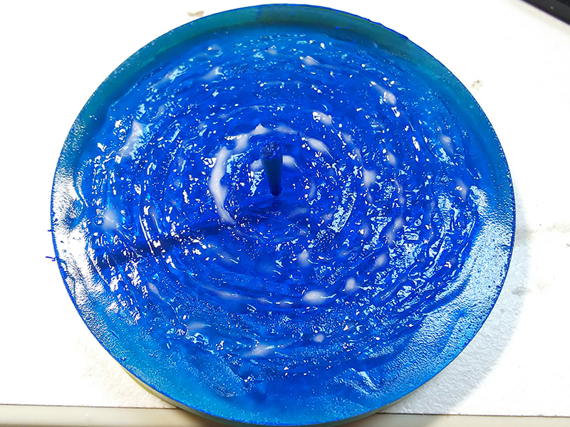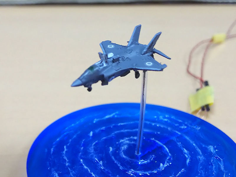 アクリル円板に穴を開けて、表面を海面仕立てにする。空母に着艦するためにホバリングしながら近づいてくるときの海面状態をそれっぽく作ってみる。