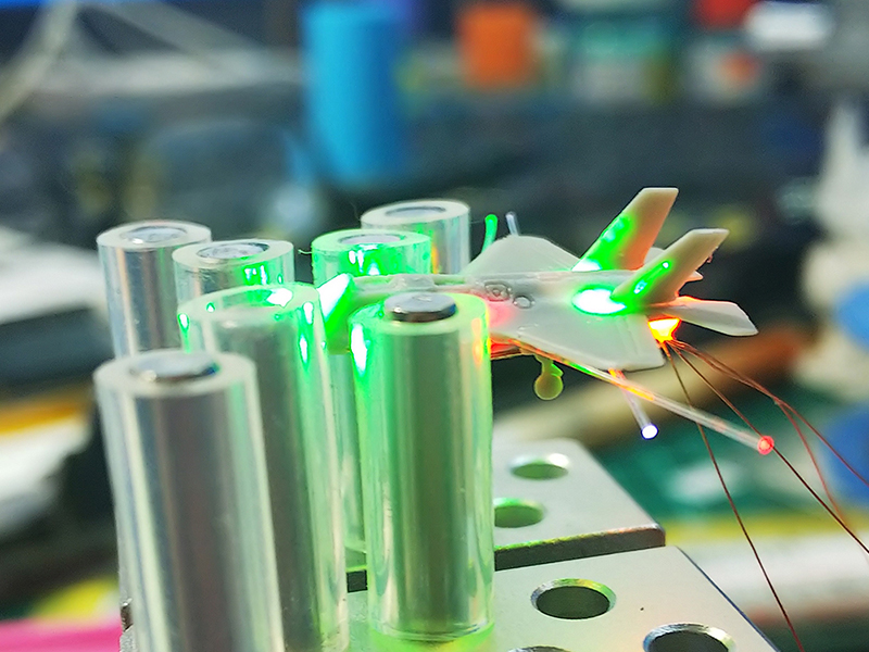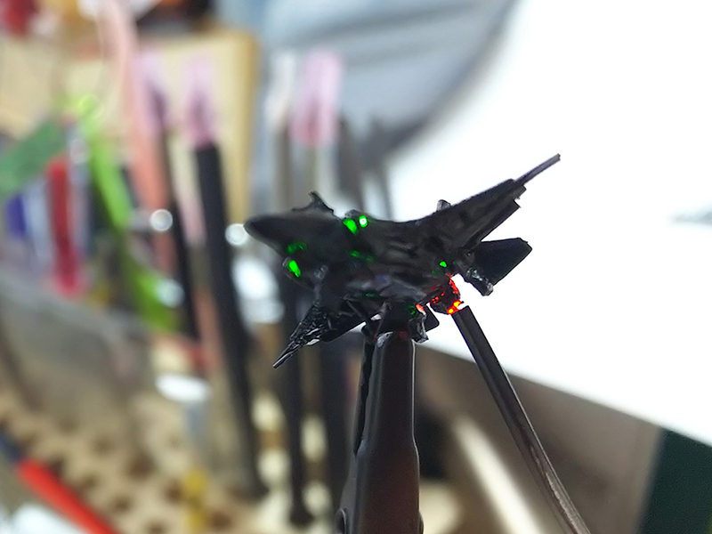 仕込んだLEDが点灯することはもちろんだけど、機体内部側に光が漏れてないことや、光ファイバーの先端に光が意図した光が届いていることなどを確認する。垂直尾翼の編隊灯も緑の光が届いているのでOKやね。