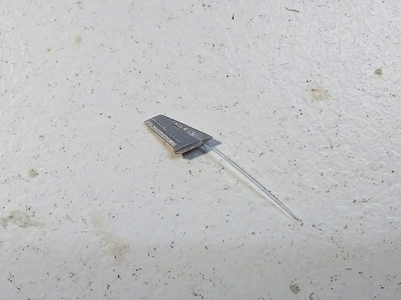 垂直尾翼を機体に取り付ける時にこの光ファイバーを差し込む穴も機体側に開けておく。※光ファイバの根元機体側にはLED緑が居る状態。これで、機体内部の緑光源が垂直尾翼の側面に出てくるようになる。